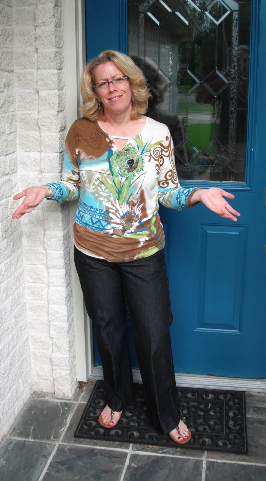 And now, it's time for Fashion Friday - Frump Edition. I had a hard time with my outfit this week...we had a reception on Thursday evening, so I needed to dress up a little more than my normal summertime uniform of Bermudas or Capris and a top. I wanted to wear my recently acquired funky top with my nice jeans, but when I put it on...